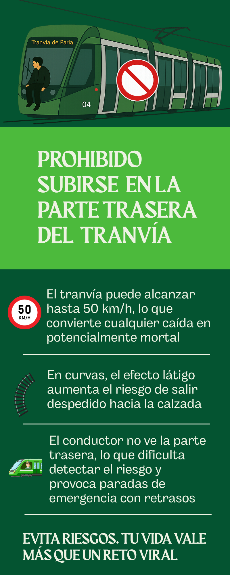 Tranvía de Parla alerta y prohíbe el acceso al carenado trasero o el agarre de las personas con patinetes al tranvía. Estos comportamientos ponen en riesgo la vida y la seguridad de todos.